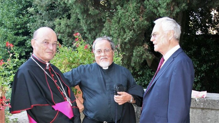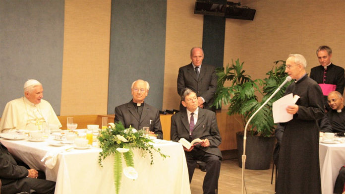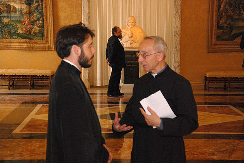Nach der Anreise und gemeinsamem Mittagessen mit dem Schülerkreis war der Neue Schülerkreis am Samstag in eigener Runde zusammen- gekommen um drei neue Mitglieder in seinen Reihen zu begrüßen. Bei dieser ersten Arbeitssitzung, bei der zunächst organisatorische Angelegenheiten geklärt wurden, befassten sich die Theologen dann mit dem Thema "Mission". Ganz bewusst hatte sich der Kreis eben dieses Thema gewählt, mit dem sich auch der Schülerkreis und Papst Benedikt in diesen Tagen beschäftigten. Aus dem zusammengestellten und zuvor bearbeiteten Reader hatten die einzelnen Mitglieder jeweils einen Text Ratzingers zum Thema der Mission zu präsentieren und zur Diskussion zu stellen. Gemeinsam mit dem Schülerkreis des Papstes, dem der Neue Schülerkreis an dieser Stelle herzlichen für die Einladung und die Zusammenführung in dieser Runde dankt, konnten die fachlichen und persönlichen Gespräche am Abend fortgeführt werden. Der Sonntag stand im Zeichen der Begegnung mit dem Heiligen Vater. Am Nachmittag kam es dann zu einem Arbeitstreffen mit den diesjährigen Referenten des nichtöffentlichen Treffens von Papst und Schülerkreis, dem evangelischen Missionswissenschaftler und Ökumene-Experte Prof. Peter Beyerhaus aus Tübingen sowie dem emeritierte evangelische Münchner Theologieprofessor Heinz Bürkle, der zur katholischen Kirche konvertiert ist. Beide machten ihre Thesen auch dem Neuen Schülerkreis zugänglich, was vom gemeinsamen Gespräch der beiden Schülerkreise umrahmt wurde. Gemeinsam mit einigen Vertretern des Schülerkreises stellten sie den jungen Theologen ihre Gedanken zum Thema "Mission unter den Völkern: ihre Rechtfertigung und ihre Form heute" vor, die sie am Samstag bei der Sitzung mit dem Heiligen Vater referiert hatten.